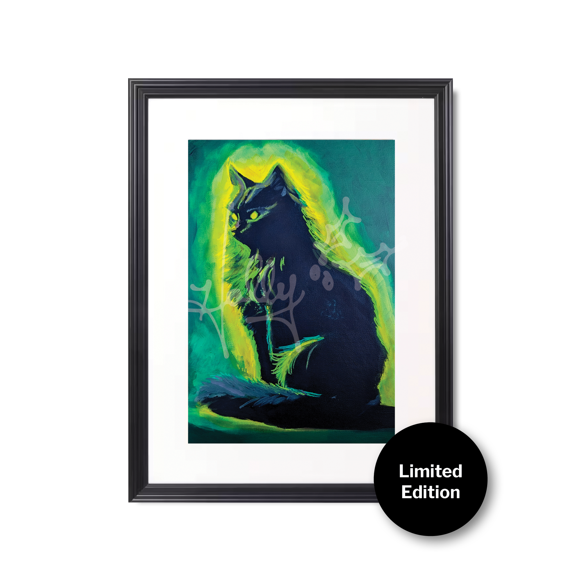 Signed and numbered giclée print of "9 Lives No. 2" by Holly Bones. Limited edition, as only 6 prints are available in this format. It comes professionally matted and framed, ready for your space.