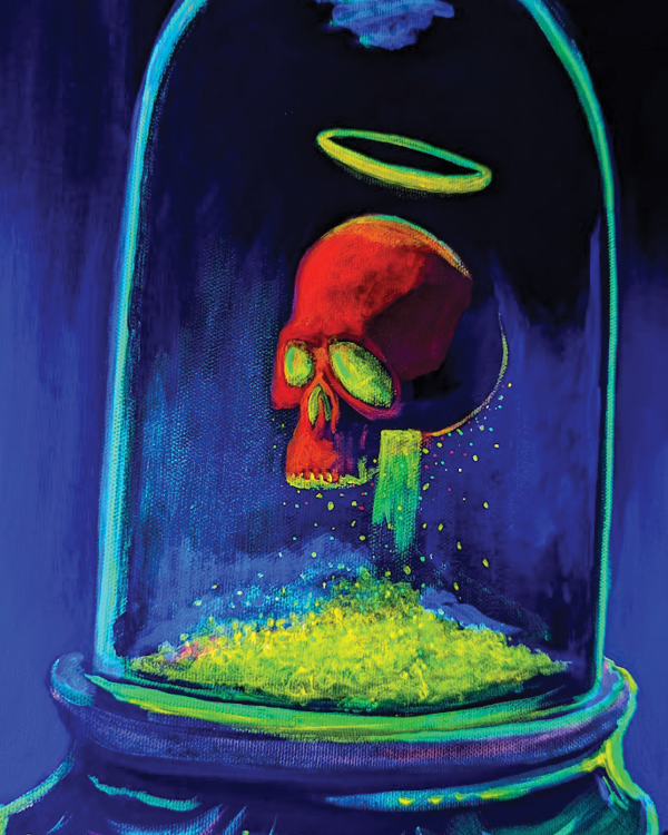 "A Study in Fluorescence" was painted in 2024 on an 11" x 17" canvas panel using acrylic paint. This piece marked my initial foray into working with UV-reactive paints. It features a skull showcased within a cloche dome, which gains an eerie luminescence when viewed under black light. Although I thoroughly enjoy creating these black light pieces, the main challenge is that the captivating glowing effect cannot be replicated in prints.