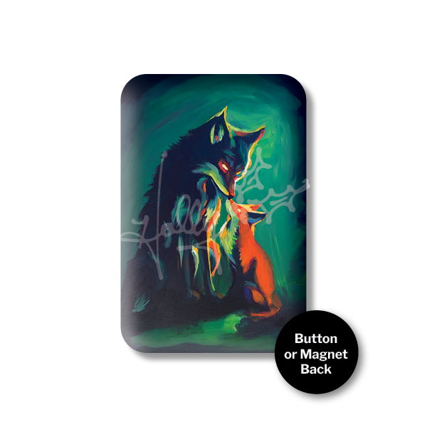 A durable, button or magnet featuring my “Fox & Wolf No. 2” artwork, hand-pressed by me in my Ypsilanti studio.
