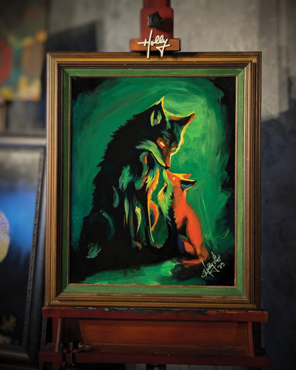 "Fox & Wolf No. 2" was created in 2025 on a 16" x 20" stretched canvas using acrylic paint. Continuing the inspiration behind "Fox & Wolf No. 1," this piece further explores the enchanting dynamic between a fox and a wolf, blending my favorite animal with my significant other's. It's a harmonious depiction of two powerful and resilient creatures.