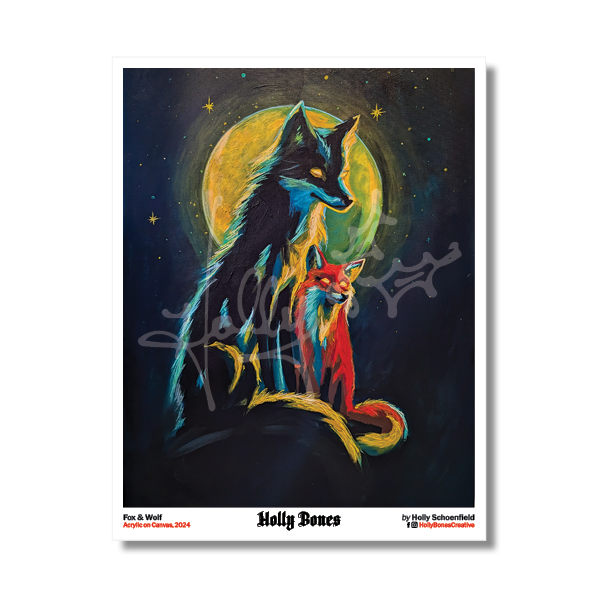 This is an 8” x 10” open edition giclée print of "Fox & Wolf No. 1" by Holly Bones.