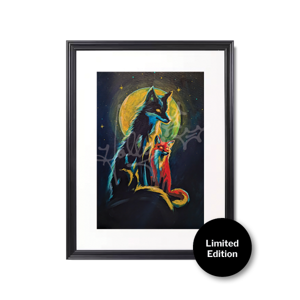 Signed and numbered giclée print of "Fox & Wolf No. 1" by Holly Bones. Limited edition, as only 6 prints are available in this format. It comes professionally matted and framed, ready for your space.