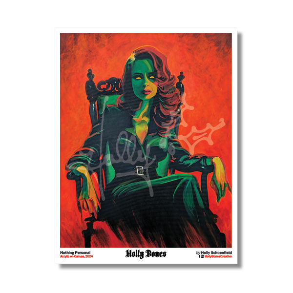 This is an 8” x 10” open edition giclée print of “Nothing Personal” by Holly Bones.