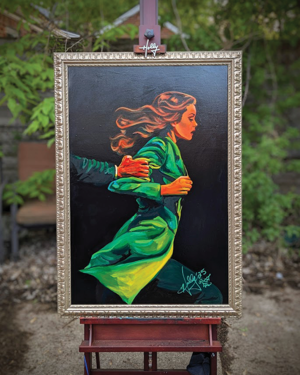 "Regression" was created in 2025 on a 24" x 36" stretched canvas using acrylic paint. This piece depicts a woman attempting to flee a male figure, only to be pulled backward, a visual representation of women being held back. It's part of my ongoing "No Hard Feelings" project in collaboration with local poet Amy Probst.